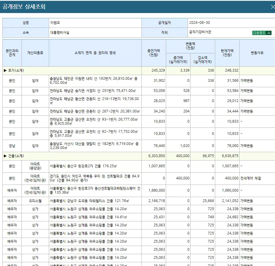 재산 공개 상세 내역을 직접 살펴본다면, 어떻게 재산을 증식했는지 보입니다. 공직자의 재산 내역이 궁금하다면 직접 확인해보시기 바랍니다.