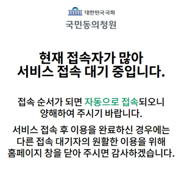 이처럼 많은 사람들이 청원에 동의하면서 국회 홈페이지의 국민동의청원 게시판은 접속 지연을 겪고 있습니다. 청원에 참여하려는 사용자들이 몰려 서버가 과부하되는 상황이 발생하고 있는 것입니다. 이는 국민의 높은 관심을 반영하는 한편, 서버의 용량 및 접근성 문제를 드러내는 부분이기도 합니다.