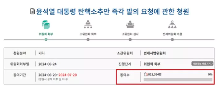 최근 윤석열 대통령의 탄핵을 요구하는 국민청원이 국회 홈페이지에서 큰 반향을 일으키고 있습니다. 지난 6월 16일에 시작된 이 청원은 7월 1일 오후 2시 30분 기준으로 82만 명 이상의 동의를 얻어내며, 국민의 높은 관심을 받고 있습니다.