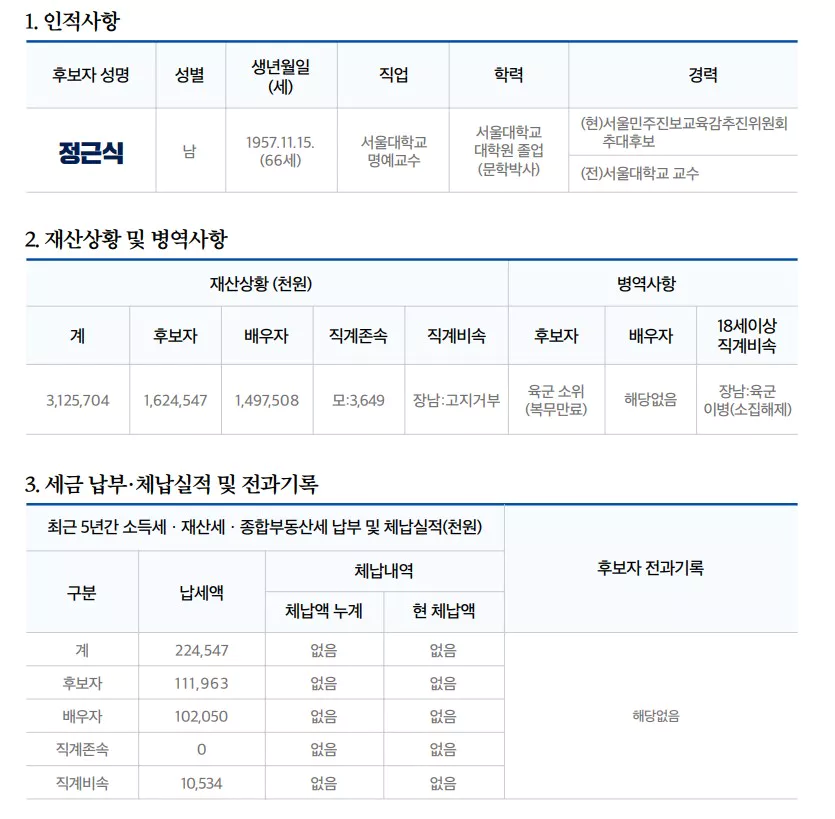 서울시 교육감 후보 정근식의 후보자 정보 공개 자료의 내용은 아래와 같습니다.