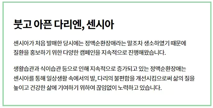 센시아는 정맥 건강을 유지하고 정맥순환장애로 인한 다양한 증상을 완화하는 데 도움을 주는 제품입니다. 정맥 및 림프 부전으로 인한 불편함을 줄이고, 일상생활에서의 활동성을 높이며, 전반적인 삶의 질을 향상하는 데 기여합니다. 정맥 건강을 유지하고자 하는 사람들에게 센시아는 효과적인 선택이 될 수 있습니다.
