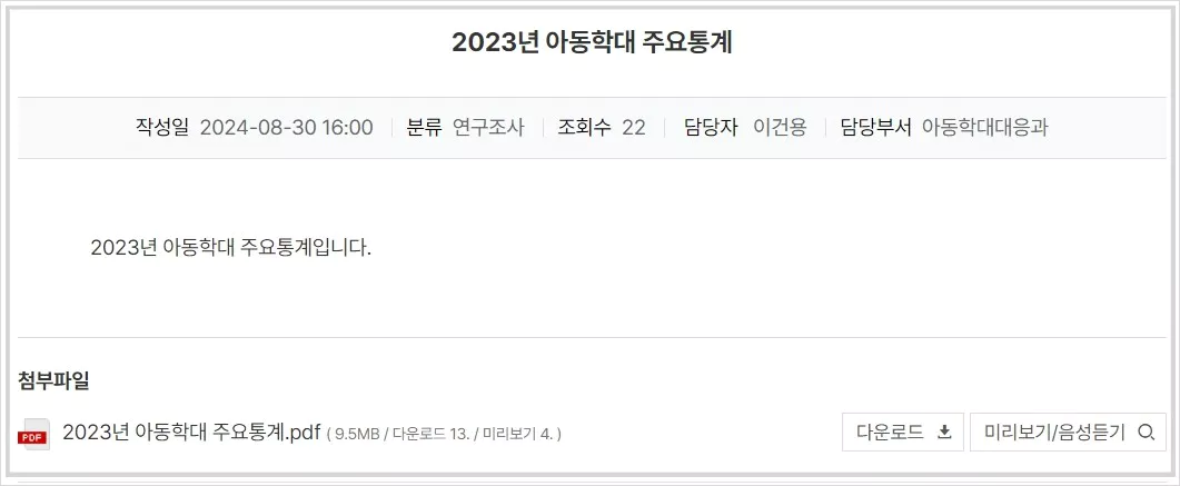 이번 연차보고서에 담긴 2023년 아동학대 관련 주요 통계는 보건복지부 누리집에서 확인할 수 있으며, 이를 통해 정부와 사회가 함께 아동학대 문제를 해결하는 데 중요한 자료로 활용될 것입니다.
