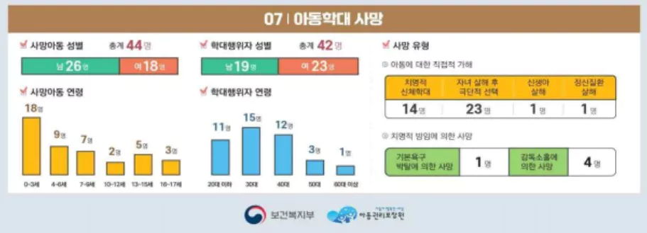 2023년 아동학대로 사망한 아동은 총 44명으로, 전년도 50명에 비해 6명 감소했습니다. 사망한 아동 중 36개월 미만의 영유아가 13명(29.5%), 6세 이하의 아동이 27명(61.4%)으로 나타나, 여전히 어린 연령층에서의 학대가 심각한 문제로 대두되고 있습니다.