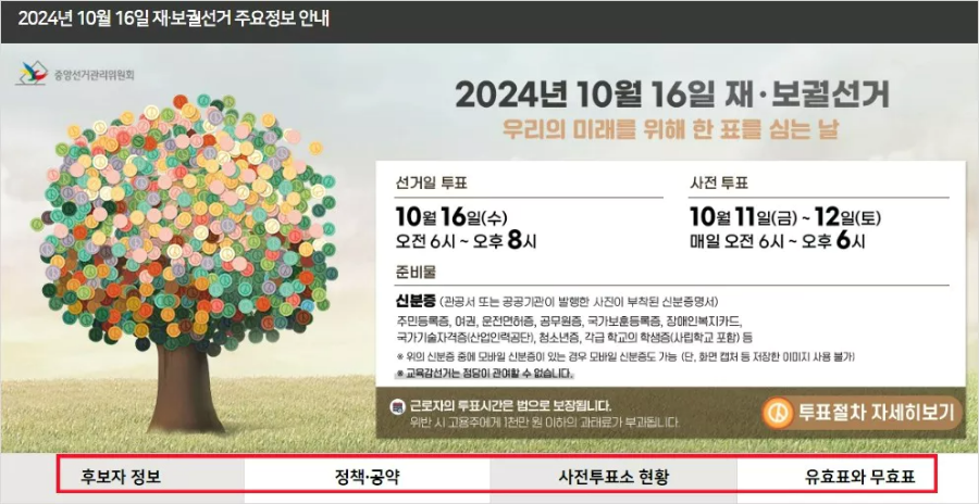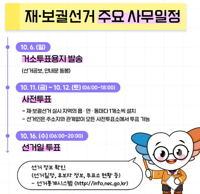 10월 16일 재보궐선거에 관해서는 중앙선거관리위원회의 재보궐선거 특집 홈페이지에서 자세히 확인할 수 있습니다.