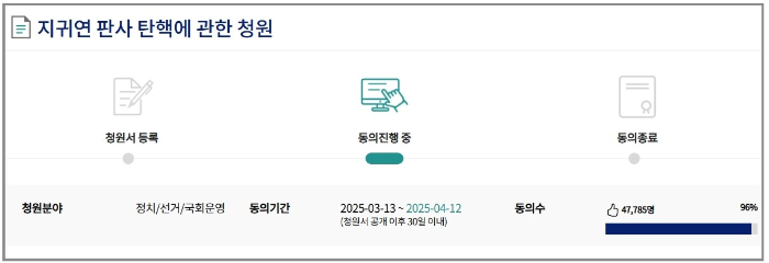 지 판사는 윤 대통령의 구속을 취소하고 석방 상태에서 재판을 받을 수 있도록 한 것이죠. 이에 지귀연 판사를 탄핵하라는 국민청원이 진행 중입니다. 국민청원은 4월 12일까지 진행되며, 현재 47,785명이 지귀연 판사를 탄핵하라는 청원에 동의했습니다.