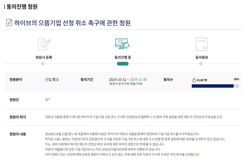 청원자는 지난달 15일 열린 국회 환경노동위원회 국정감사에서 더불어민주당 박홍배 의원이 하이브의 으뜸기업 선정 취소를 요구한 사실을 언급하면서, 고용노동부가 구체적인 조사 진행 상황을 공개하지 않는 점에 대한 불만을 표했습니다.